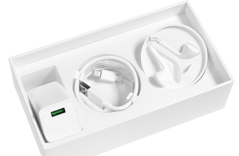 یہ کافی بڑے پیکج میں آتا ہے، جس میں اسمارٹ فون ہی، ایک ہیڈسیٹ، ایک مائیکرو USB کیبل (معیاری ہڈی کی لمبائی)، تیز رفتار چارجنگ VOOC فلیش کے لیے سپورٹ والا چارجر: وولٹیج 5 وولٹ، کرنٹ 4 ایم پی ایس، سلیکون کیس اور ایک سم۔ انجکشن نکالنا.