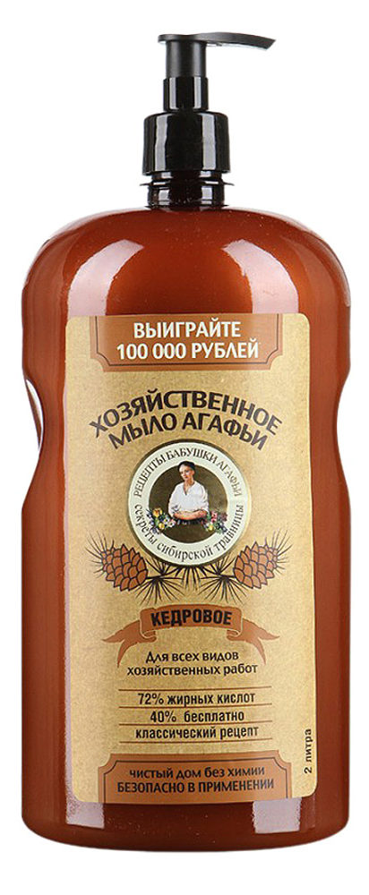 مائع صابن کی ترکیب "دادی آگافیا کی ترکیبیں" میں جونیپر کا تیل شامل ہے، جو مائکروجنزموں کی افزائش کو کم کرتا ہے اور ان کو مار دیتا ہے، اور اجزاء میں پلانٹین، مارشمیلو جڑ اور بیکل سکل کیپ کا ایک عرق ہے۔ "دادی آگافیا کی ترکیبیں" ہر قسم کی صفائی، کپڑے دھونے اور ہاتھ دھونے کے لیے موزوں ہیں۔ یہ ٹھنڈے پانی میں بھی استعمال کیا جا سکتا ہے، مادہ گندگی اور داغوں کو اچھی طرح سے ہٹاتا ہے، یہاں تک کہ پرانے بھی، یہ جلدی سے دھویا جاتا ہے اور لکیریں نہیں چھوڑتا۔ "دادی اگافیا کی ترکیبیں" میں خوشگوار خوشبو ہے۔ 2 لیٹر کین میں دستیاب ہے۔
