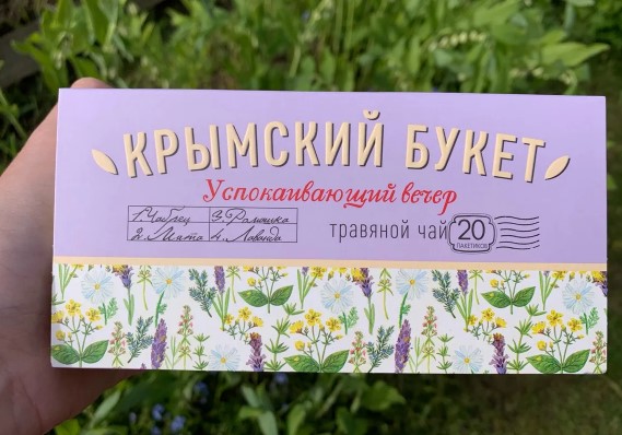 سو فیصد قدرتی گلوٹین فری جڑی بوٹیوں والی چائے جس میں قدرتی جڑی بوٹیاں شامل ہیں: تھیم، کیمومائل، لیوینڈر اور پودینہ، جو کریمیا کے محفوظ مقامات پر جمع ہوتے ہیں، مصروف دن کے بعد آرام اور سکون کو فروغ دیتے ہیں۔ اسے شام میں یا سونے سے پہلے پینے کی سفارش کی جاتی ہے۔ گتے کے باکس میں ایک ورق بیگ ہوتا ہے جس میں بیس فلٹر بیگ ہوتے ہیں جن میں بغیر کسی تار کے، جوڑے میں ایک ساتھ سولڈر کیا جاتا ہے۔ بیگ آسانی سے سوراخ شدہ لکیروں کے ساتھ الگ ہوجاتے ہیں، لیکن پکتے وقت یہ کچھ تکلیف دہ ہوتا ہے۔ لیکن سامان کی قیمت دھاگوں اور انفرادی لفافوں سے لیس اینالاگ سے بہت کم ہے۔ بیگ کے مواد صاف، دھول اور ملبے سے پاک ہیں۔جڑی بوٹیاں ذائقہ اور خوشبو کے لیے بہترین ہیں۔