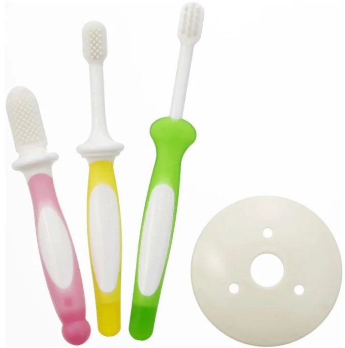 جاپانی مینوفیکچرر کی طرف سے یہ اختیار 3 برشوں کا ایک سیٹ ہے جو بچے کی مختلف عمروں کو نشانہ بنایا جاتا ہے۔ درخواست دانتوں سے 3 سال تک کی سفارش کی جاتی ہے. یہ سیٹ آپ کو اپنے بچے کو قدم بہ قدم منہ کی صفائی سکھانے کی اجازت دیتا ہے۔ سیٹ میں پہلا برش (گلابی) بچے کو دانت نکلنے کے دوران تکلیف دور کرنے کے ساتھ ساتھ منہ کی صفائی کی ضرورت کے عادی ہونے میں مدد کرتا ہے۔ دو طرفہ ربڑ کے برسلز نرم ہوتے ہیں، برسلز مختلف لمبائی کے ہوتے ہیں اور سرے کی طرف پتلے ہوتے ہیں۔ دوسرا (پیلا) سامنے کے دانتوں کی ظاہری شکل کے بعد استعمال کے لیے تجویز کیا جاتا ہے۔ برسل یک طرفہ سلیکون ہے۔ تیسرا (سبز) ایک سال سے زیادہ عمر کے بچوں کے لیے ہے۔ یہ بچوں کو اپنے دانت خود برش کرنا سکھانے کے لیے ڈیزائن کیا گیا ہے۔ برسلز پہلے ہی عام مواد سے بنے ہیں۔