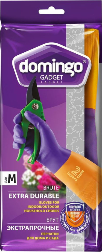 DOMINGO ایک خصوصی پیٹنٹ ٹیکنالوجی کا استعمال کرتے ہوئے سامان تیار کرتا ہے۔ مصنوعات کی 2 پرتیں ہیں: لیٹیکس اندرونی، نیوپرین بیرونی۔ یہ بیرونی نقصان کے خلاف قابل اعتماد تحفظ کو یقینی بناتا ہے۔ اندر نامیاتی کپاس کے ساتھ اہتمام کیا جاتا ہے. نالیدار سطح آبجیکٹ پر مضبوط، محفوظ گرفت فراہم کرتی ہے۔ ان میں باغ کے اوزار کے ساتھ کام کرنا آسان ہے۔قیمت: 376 روبل۔