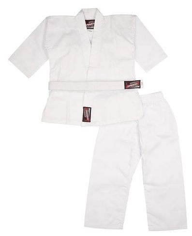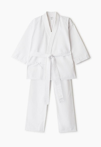 سفید، آرام دہ، عملی. کراٹے شروع کرنے والوں کے لیے مثالی۔ 100% کاٹن، جیکٹ، ٹراؤزر اور بیلٹ سے بنا۔