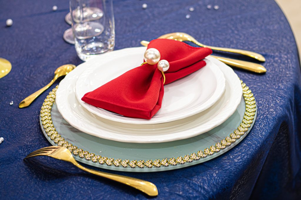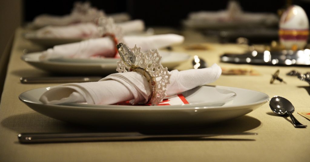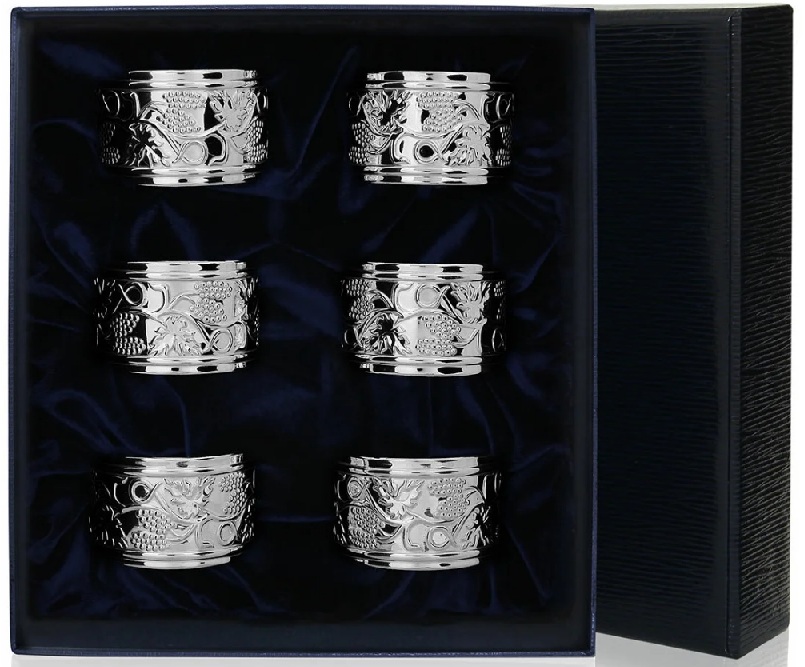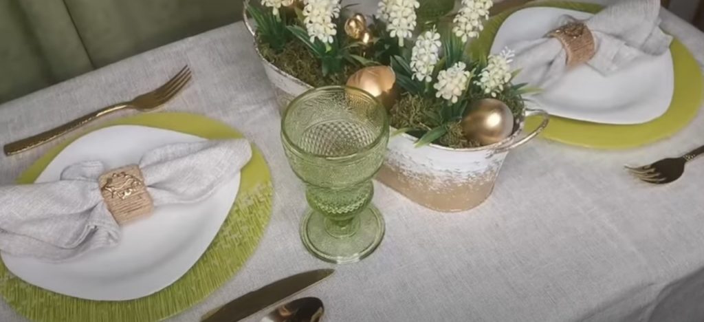 دھاتی سجاوٹ، اکثر چاندی سے، کم اکثر سونے سے، سازگار طور پر برتنوں، میز پوش پر پیٹرن عناصر، اور اندرونی رنگ کے مجموعی رنگ کی بازگشت۔ میز پر انگوٹھیوں کے لیے صرف ایک دھات استعمال کرنے کا رواج ہے۔