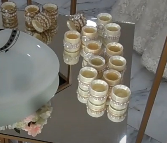 تخیل کے لئے عظیم گنجائش rhinestones کے پیٹرن کی ایک قسم ہے. کور کاغذ کے تولیوں سے لیا جاتا ہے، اسی اونچائی کے کڑا میں کاٹا جاتا ہے۔ نچلی پرت کو سفید یا پیسٹل رنگ کے ربن سے زخم کیا جاتا ہے، اس کے بعد سرونگ کے لہجے کے مطابق ایک روشن رنگ میں تنگی ہوتی ہے۔ ایک گلو بندوق کی مدد سے، rhinestones کے ایک سیٹ سے ایک تخلیقی پیٹرن لاگو کیا جاتا ہے.