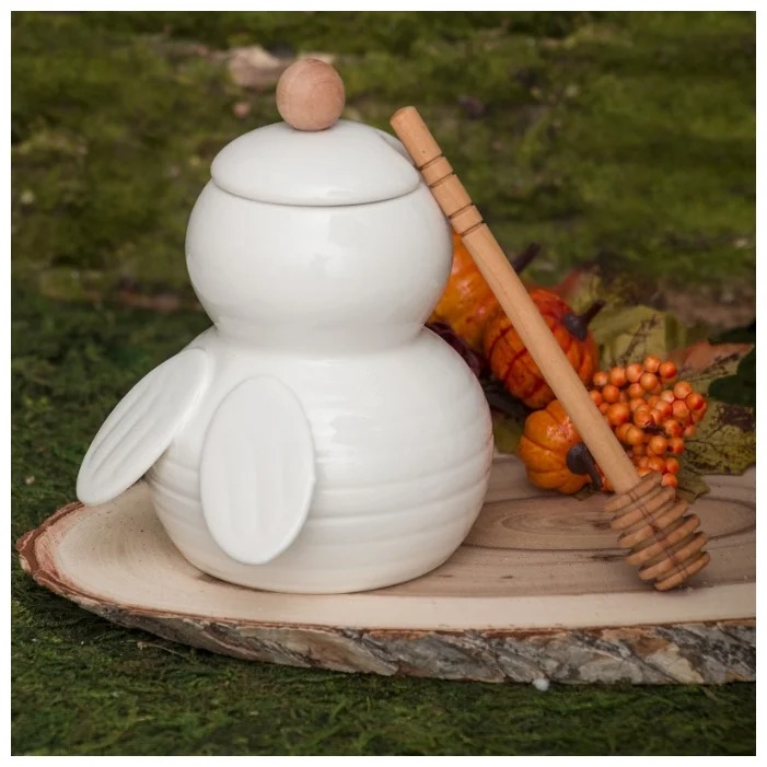 کنٹینر ایک بہت ہی غیر معیاری ڈیزائن کی طرف سے ممتاز ہے اور شہد کو ذخیرہ کرنے کے لیے ایک خاص کنٹینر کو کامیابی سے تبدیل کر سکتا ہے۔ اس ڈش کا ایک خاص فائدہ قدرتی لکڑی سے بنا تکلا کی شکل کا چمچ ہے، جو آپ کو ایک قطرہ بولے بغیر مائع، عنبر کی مٹھاس حاصل کرنے کی اجازت دیتا ہے۔