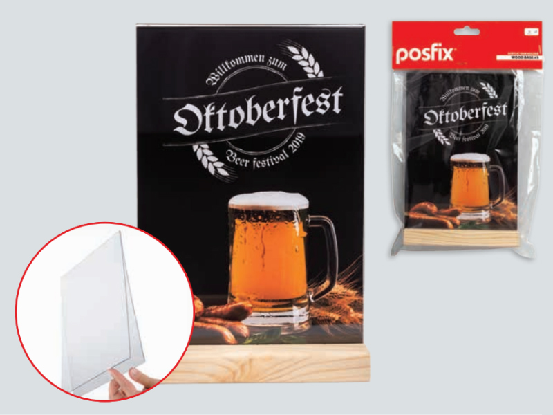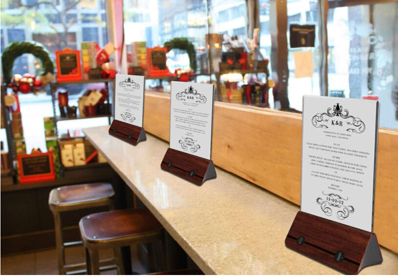 ٹھوس لکڑی کی بنیاد کے ساتھ ایکریلک مینو ہولڈر۔ یہ معلومات، مینو کارڈ، گاہکوں اور مہمانوں کو راغب کرنے کے لیے صحیح قدم رکھنے کے لیے ایک ون اسٹاپ حل ہے۔