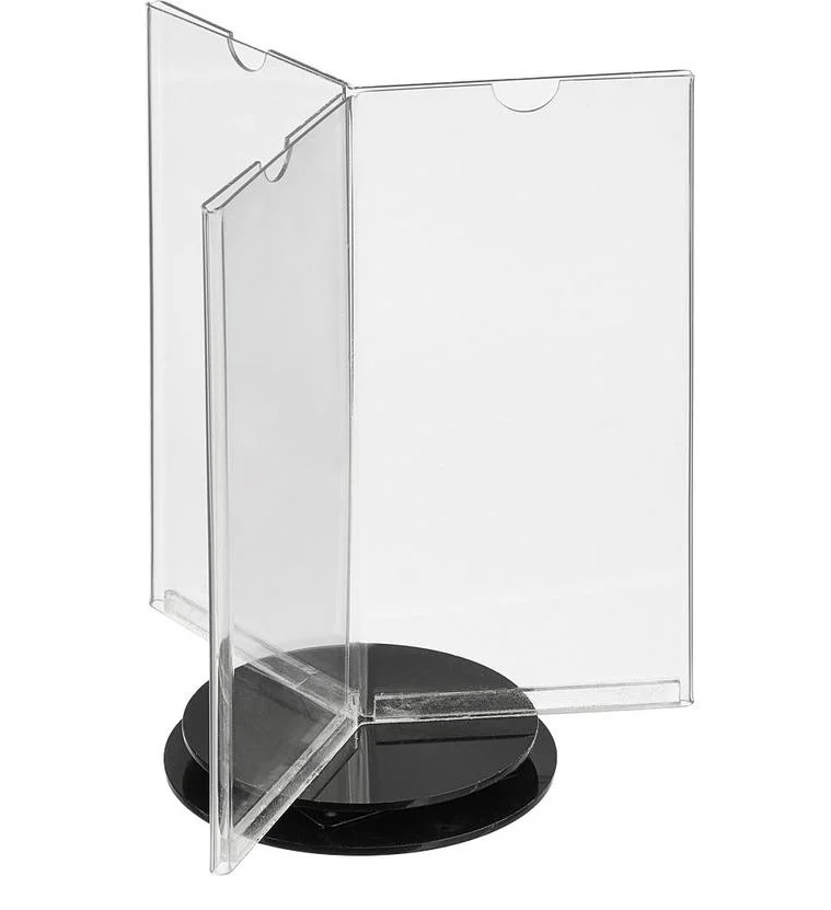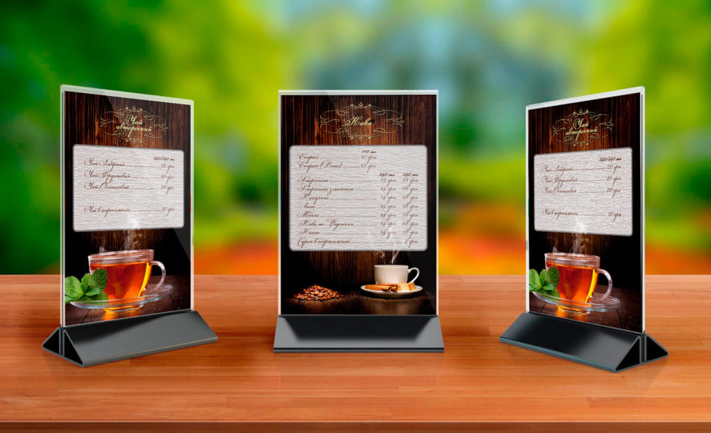 تین طرفہ ڈیوائسز شفاف اسٹینڈز کی ایک قسم ہیں جو ریستوران یا کیفے کے مہمان کی میز پر نصب کی جا سکتی ہیں۔ ایسے مواد کا استعمال ان لوگوں کے لیے فائدہ مند ہے جو ایک ہی وقت میں کئی قسم کی معلومات ایک میز پر رکھنے کا ارادہ رکھتے ہیں (مثال کے طور پر، نئی ڈشز اور پروموشنز کے بارے میں معلومات)۔ اکثر، زائرین، اپنے آرڈر کا انتظار کرتے ہوئے، مینیو ہولڈرز کو دیکھتے ہیں، تاکہ وہ فوری طور پر آپ کی منافع بخش پیشکش کے بارے میں جان سکیں۔