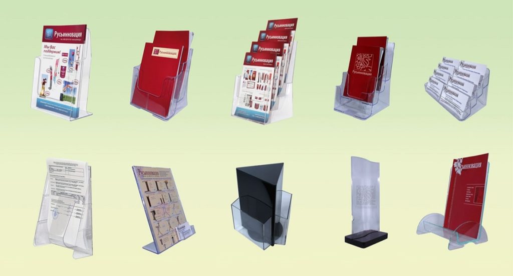 مینو کارڈ ہولڈرز اور معلوماتی کتابچے کی تیاری کے لیے، آلہ کی انفرادی خصوصیات کو مدنظر رکھتے ہوئے، 1.5 سے 3 ملی میٹر کی موٹائی کے ساتھ، آرگینک گلاس زیادہ استعمال کیا جاتا ہے۔