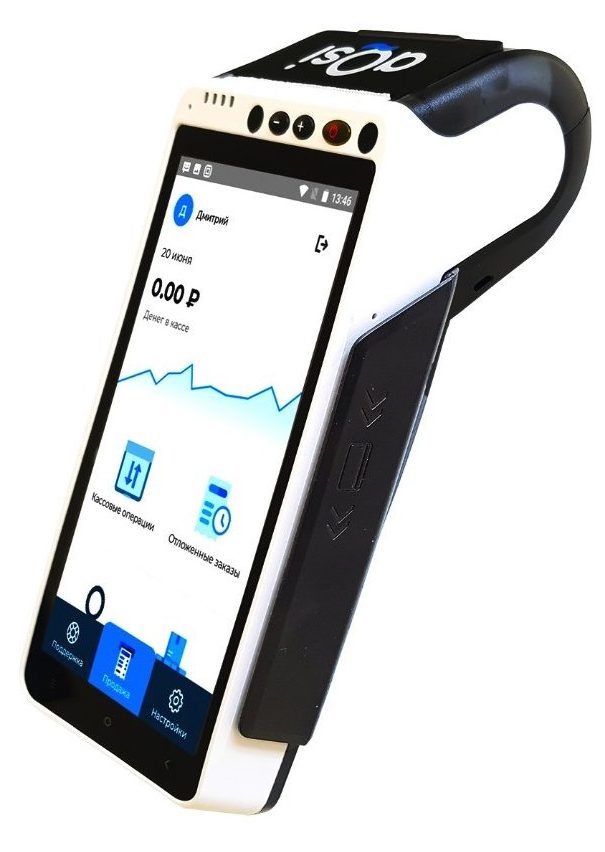 ڈیوائس حاصل کرنے کے ساتھ لیس ہے، جو آپ کو ایک بینک کارڈ کے ساتھ خریداری کے لئے ادائیگی کرنے کی اجازت دیتا ہے. بیٹری کی زندگی 15 گھنٹے ہے۔ بارکوڈ سکینر پہلے سے ہی آلات میں بنایا گیا ہے۔