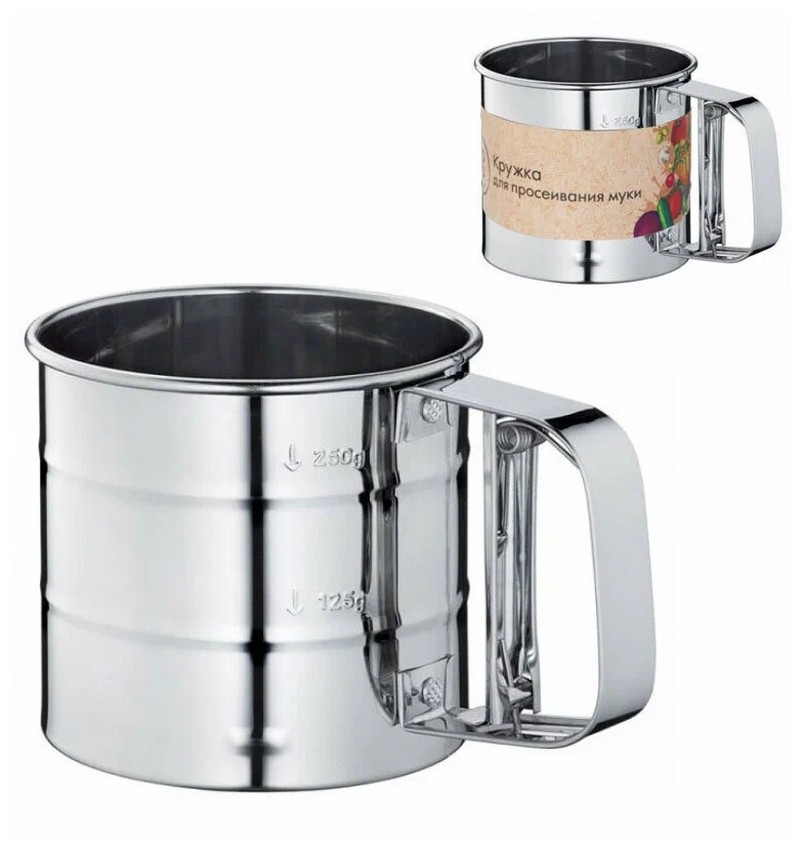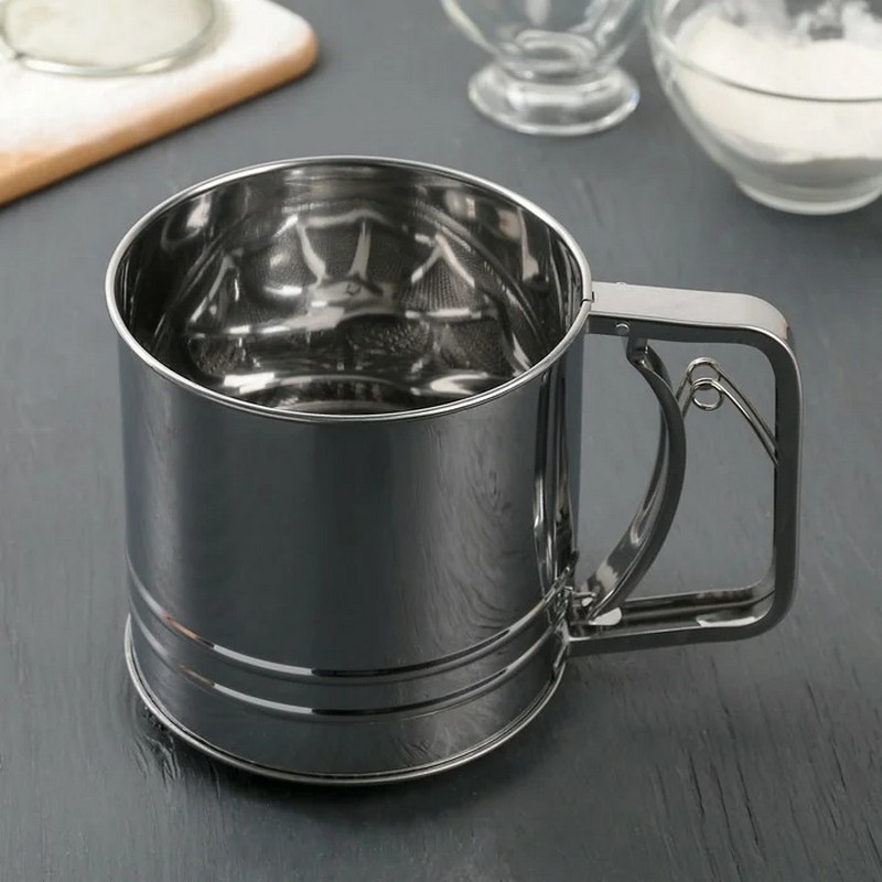 مگ کی شکل میں بنائی گئی ایک خاص چھلنی آٹا، چینی اور دیگر بڑے اجزاء کو چھاننے کے لیے بہترین ہے۔ڈیوائس میں دو چھلنی ہیں، جس کی بدولت آٹا بہتر طور پر چھان لیا جاتا ہے اور آکسیجن سے سیر ہوتا ہے۔ چھلنی کے دوران خام مال کو کام کرنے والی سطح پر بکھرنے نہ دینے کے لیے، نیچے سے ایک تنگ ہونا ہے۔ چھلنی سٹینلیس سٹیل سے بنی ہے۔