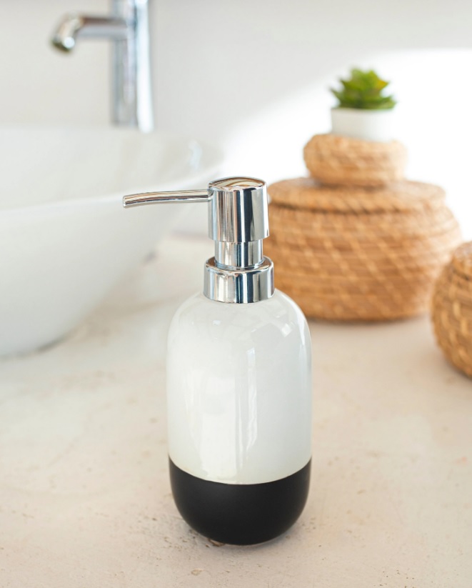 سیرامک کنٹینر کو کمرے کے جدید اور مختصر اندرونی حصے کے ساتھ ملایا گیا ہے۔ بلیک کلیکشن میں صابن کی ڈش، ایک گلاس اور ٹوائلٹ برش بھی شامل ہے۔ اسی انداز میں ڈیزائن کمرے کو مزید جمالیاتی بنا دے گا۔