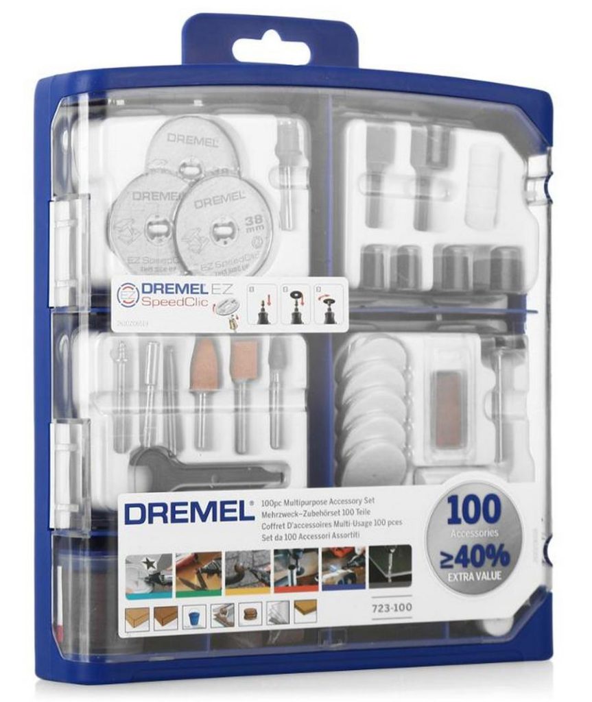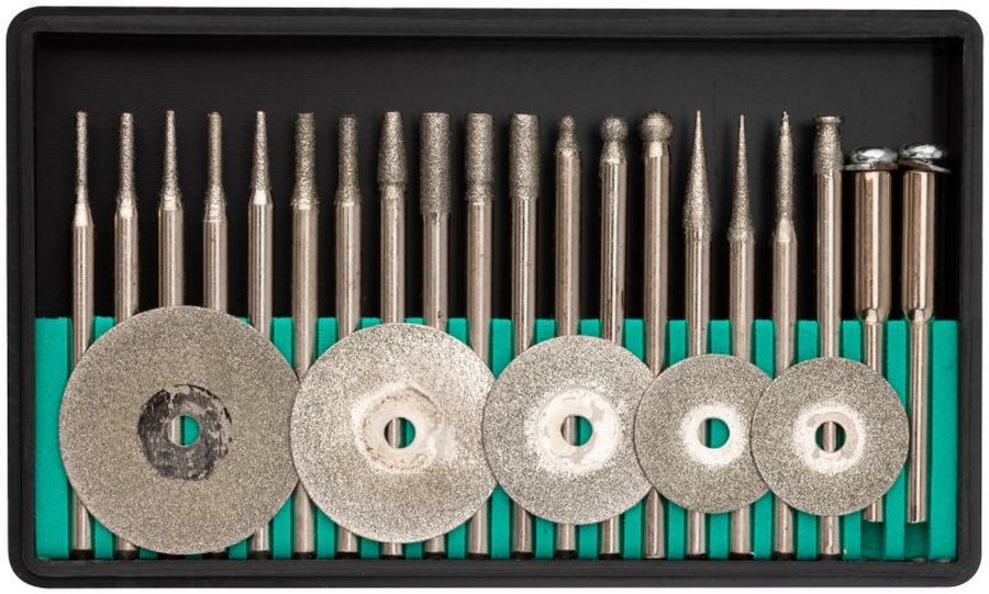 سیٹ کٹر (18 پی سیز) اور ڈسک (5 پی سیز) پر مشتمل ہے اور اسے لکڑی، سیرامکس، دھات اور یہاں تک کہ کنکریٹ پر کام کرنے کے لیے ڈیزائن کیا گیا ہے۔ تمام لوازمات ٹول اسٹیل سے بنے ہیں، کٹنگ کناروں کو مصنوعی ہیروں سے بنایا گیا ہے۔ سیٹ پیشہ ور افراد اور ابتدائی دونوں کے لیے موزوں ہے۔