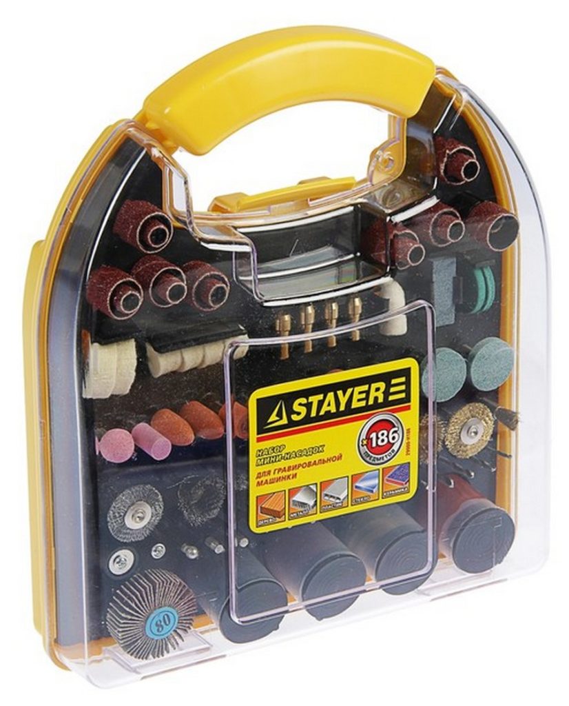 سیٹ کسی بھی پیچیدگی کے کام کی پیداوار کے لئے کندہ کاری کی مشینوں کے لئے منی نوزلز پر مشتمل ہے۔ کٹ میں مختلف اناج کے سائز اور ٹولز کی شکل کی تبدیلی اعلی درستگی سے کاٹنے، دھاتی چمکانے، پیسنے (پلاسٹک-لکڑی دھات) کی اجازت دیتی ہے۔ نقل و حمل کے لئے ایک آسان صورت میں، ایک کندہ کاری کی مشین کے لئے ایک خاص جگہ ہے.