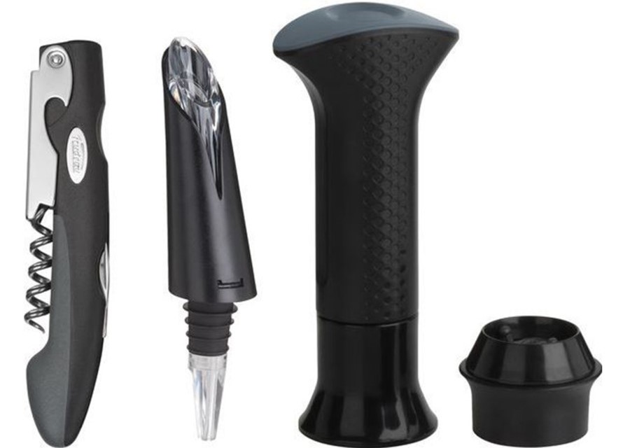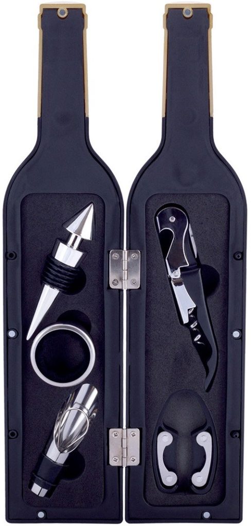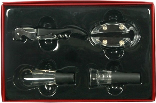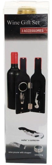 اس کمپنی میں اس زمرے کی مصنوعات کو خوبصورت روشن پیکیجنگ میں شراب کی بوتلوں کی شکل میں پیش کیا جاتا ہے۔ ماڈلز 3 ورژن میں دستیاب ہیں۔ مشمولات: کارک سکرو، انگوٹی، ڈسپنسر، فوائل کٹر، طویل مدتی اسٹوریج کے لیے روکنے والا۔ پیکیج کے طول و عرض: 7.5x7.5x32.5 سینٹی میٹر۔ اصل ملک: چین۔ قیمت: 1245 روبل۔