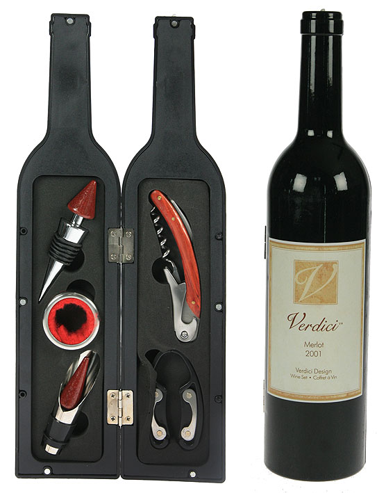 شراب کی بوتل کی شکل میں لوازمات کا ایک سیٹ سرخ شرابوں، سفیدوں اور شیمپین کے لیے موزوں ہے۔ مکمل سیٹ: ورق چاقو، شراب کو کھولنے کے لیے چاقو کے ساتھ کارک سکرو، شراب کو میز کے کپڑے پر گرنے سے روکنے کے لیے ایک انگوٹھی، ایک ڈسپنسر کے ساتھ ایک سٹاپ، ایک ذخیرہ کرنے والا۔ پیکیجنگ دھندلا مواد سے بنی ہے۔ سائز: 7x7x32 سینٹی میٹر۔ اوسط قیمت: 1182 روبل۔