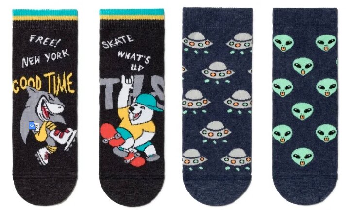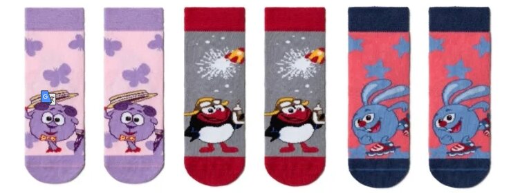 کلاسک شکل کے تین جوڑے، درمیانی لمبائی۔ ٹھوس حصے: ہیل، پیر، لچکدار بینڈ. کارٹون "Smeshariki" کے حروف اوپری طرف واقع ہیں.رنگنے: گرے \ سرخ، گلابی \ lilac، آڑو \ گہرا بھوری رنگ۔