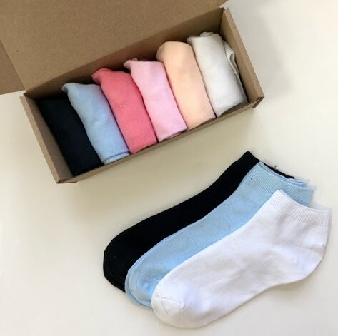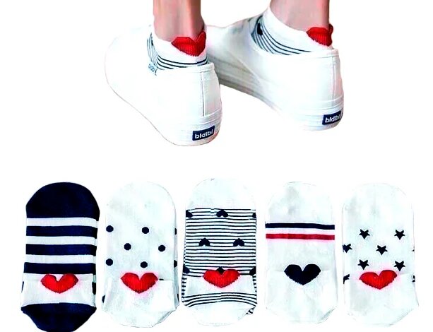 کٹے ہوئے جرابوں کے 10 جوڑوں کا پیک۔ مکمل سیٹ - 2 رنگوں کے لیے 5 اختیارات۔ وہ سفید پس منظر (چوڑا، درمیانے، پتلی)، زیور (ستارے، دائرے) پر سیاہ پٹیوں کی چوڑائی میں مختلف ہوتے ہیں۔ اسی تفصیل کے پیچھے ایک دل (سرخ، سیاہ) ہے.