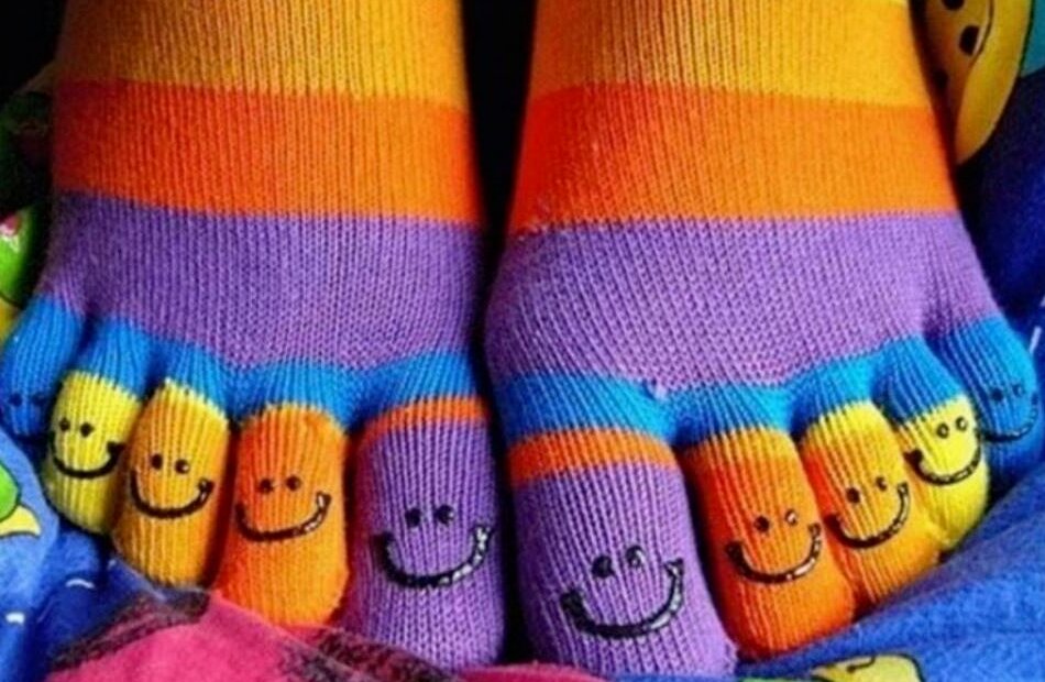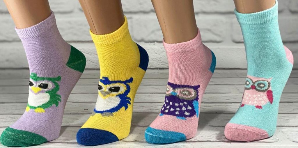 بچوں کے موزے رنگین پھولوں، کارٹون کرداروں، جانوروں کی تصاویر کے ساتھ کھڑے ہیں۔