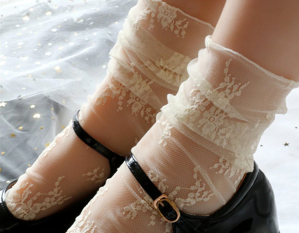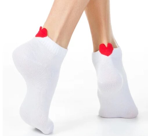 سفید کٹے ہوئے موزے، لچکدار بینڈ کے اوپر، پیٹھ پر ایک سرخ دل دکھاتے ہیں۔