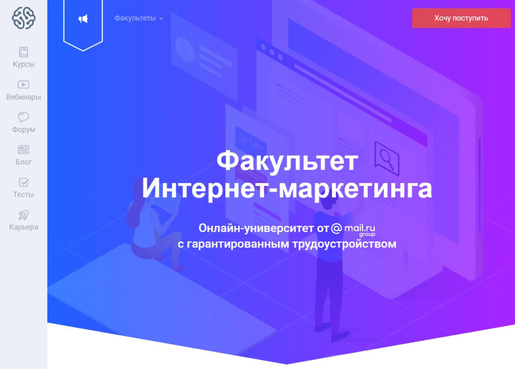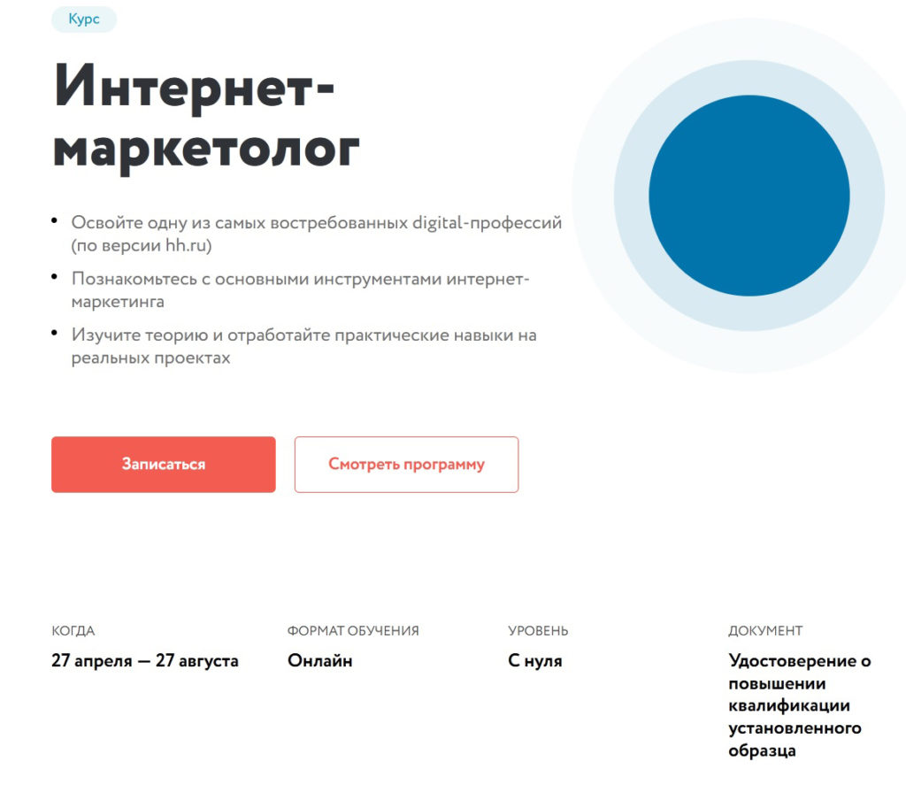 یہ تعلیمی پروگرام پانچ ماہ تک جاری رہتا ہے، فاصلاتی تعلیم کے دوران طلباء انٹرنیٹ مارکیٹنگ کی بنیادی باتیں سیکھتے ہیں، کام کے اہم ٹولز میں مہارت حاصل کرتے ہیں: