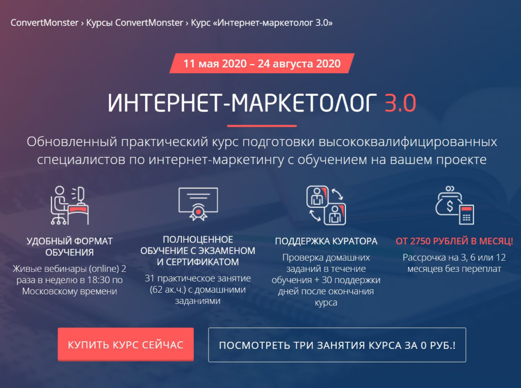 Convert Monster ایک مارکیٹنگ ایجنسی اور اس کی بنیاد پر بنائے گئے تربیتی مرکز کو متحد کرنے والا سب سے بڑا برانڈ ہے۔ اس کے علاوہ، Convert Monster Yandex.Direct اور Google AdWords کا ایک تصدیق شدہ پارٹنر ہے۔ تربیتی کورس "انٹرنیٹ مارکیٹر 3.0" تین ماہ تک جاری رہتا ہے، لیکچرز اساتذہ کے ذریعہ دیئے جاتے ہیں جو مارکیٹرز، ڈائریکٹرز، کاپی رائٹرز کی مشق کر رہے ہیں۔