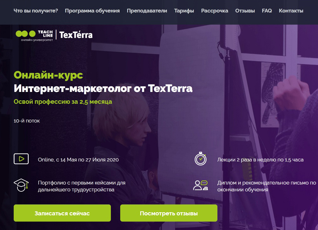 معروف ایجنسی TexTerra، جو پیچیدہ مارکیٹنگ میں مہارت رکھتی ہے، نے حال ہی میں TeachLine آن لائن یونیورسٹی کھولی۔ یہاں، تجربہ کار اساتذہ اپنے تجربے کی بنیاد پر مارکیٹرز کو تربیت دیتے ہیں۔ یہ پروگرام ڈھائی ماہ کا ہے۔ہر ہفتے، 1.5 گھنٹے کے دو آن لائن لیکچرز منعقد کیے جاتے ہیں، جو کام کے بنیادی اصولوں کا خاکہ پیش کرتے ہیں، انٹرنیٹ مارکیٹنگ کی بنیادی باتوں سے لے کر ویب اینالیٹکس تک۔
