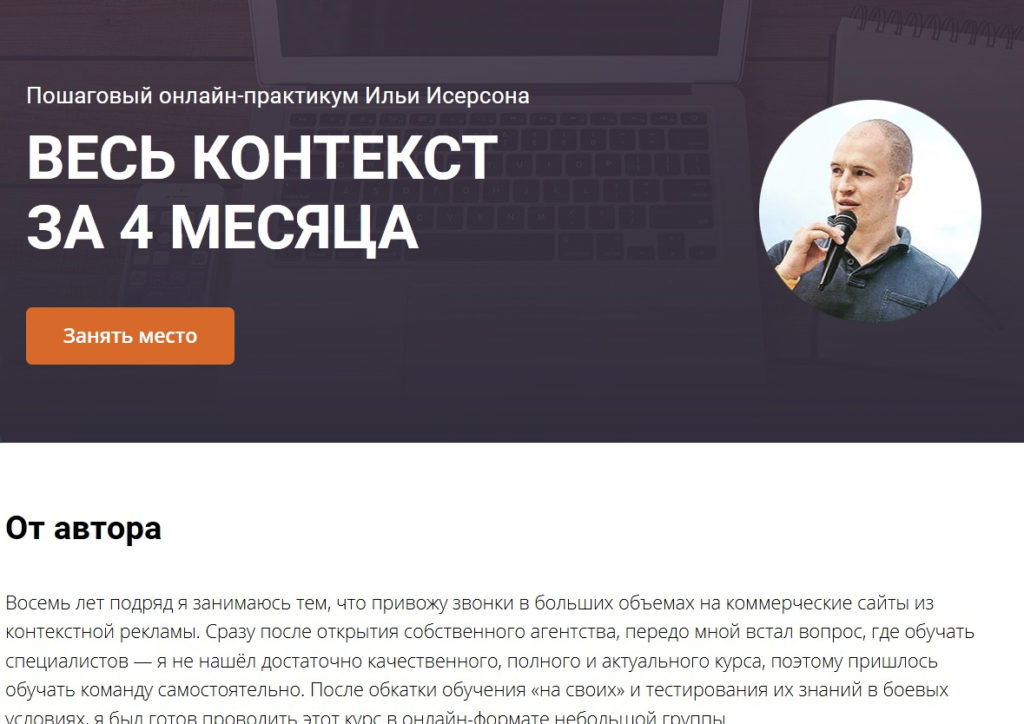 Ilya Iserson MOAB.pro مارکیٹنگ ایجنسی کے مالک ہیں۔ اپنے کورس میں، وہ متعلقہ اشتہارات کی تمام پیچیدگیاں سکھاتا ہے۔ پروگرام 16 اسباق پر مشتمل ہے، جس کے دوران صارفین اشتہاری مہمات شروع کرنے کے ٹولز میں مہارت حاصل کر لیں گے۔