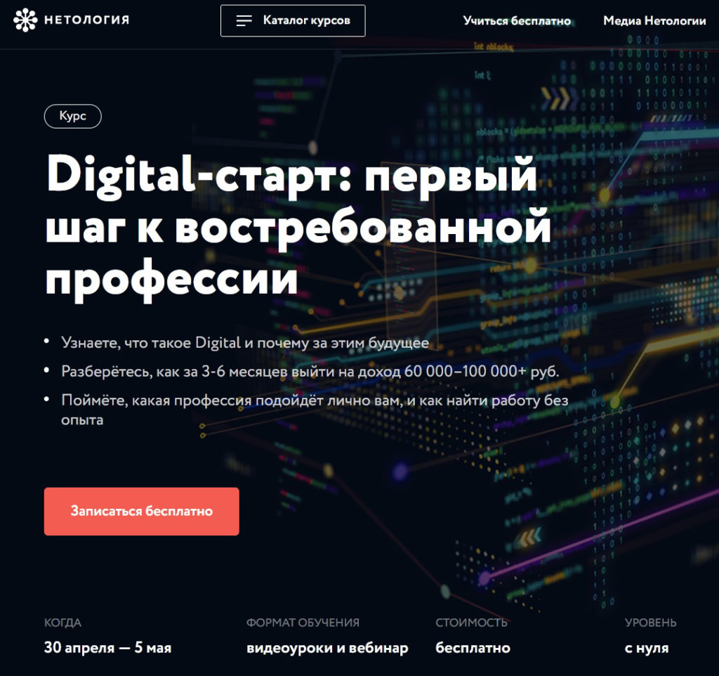 کورس کی مدت چار ماہ ہے، ہر ہفتے ایک آن لائن ویبنار منعقد کیا جاتا ہے۔ طلباء کو ایک کیوریٹر ملتا ہے جو سیکھنے کے عمل میں یا ہوم ورک کرتے وقت پیدا ہونے والے مسائل پر مشورہ دیتا ہے۔ اس کے علاوہ، ہر صارف ضروری مواد تک رسائی حاصل کر سکے گا اور ماضی کے ویبینار کی ریکارڈنگ دیکھ سکے گا۔ کل لاگت 43,500 روبل ہے۔