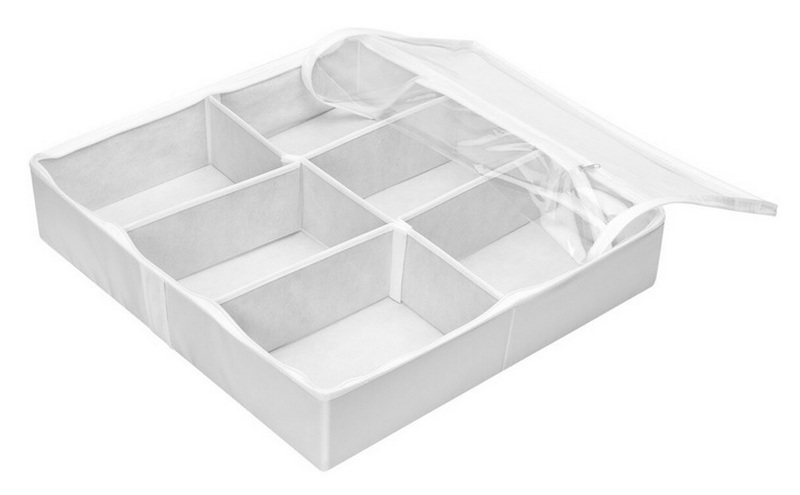 بہت سادہ اور فعال آرگنائزر۔ اس کا جسم کافی نرم ہے اور دس جیبوں پر مشتمل ہے۔ موسم گرما کے جوتے کے موسمی اسٹوریج کے لئے کامل. شفاف کور پالئیےسٹر سے بنا ہے، ایک مضبوط زپ کے ساتھ بند ہوتا ہے.ان میں سے کئی الماری کے تنوں کو عمودی پوزیشن میں ذخیرہ کیا جا سکتا ہے، اہم بات یہ ہے کہ اونچائی کے ساتھ "زیادہ" نہ کریں۔ اگر ایک مثال استعمال کی جاتی ہے، تو اسے بستر کے نیچے یا صوفے کے نیچے طاق میں رکھنا آسان ہے۔ خوردہ زنجیروں کے لئے تجویز کردہ قیمت 290 روبل ہے۔