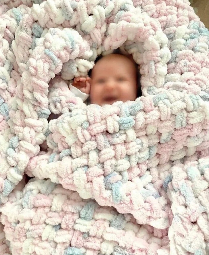 ایک خوبصورت پیٹرن کے ساتھ گرم، ابھی تک بے وزن ورژن (نیلے، گلابی انداز میں)۔ ایک کمبل کے طور پر استعمال کیا جا سکتا ہے.
