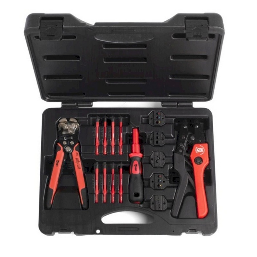 یہ کٹ پیچیدہ الیکٹریکل سرکٹس میں تاروں کو کاٹنے، اتارنے، کرمپنگ اور انٹیگریٹ کرنے کے لیے بنائی گئی ہے۔ سیٹ آفاقی ہے اور کسی بھی کام کے لیے موزوں ہے (سوائے فٹنگ کے ساتھ کام کرنے کے)۔ کٹ بڑی تعداد میں نوزلز سے بھری ہوئی ہے، وائر کٹر الگ سے فراہم کیے گئے ہیں۔ آسان نقل و حمل کے لیے تمام ٹولز ہلکے وزن اور پائیدار کیس میں رکھے گئے ہیں۔