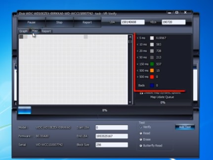 اسکین مکمل ہونے کے بعد، پروگرام عددی اقدار میں ایک رپورٹ جاری کرے گا۔ نمبر جتنا کم ہوگا اتنا ہی بہتر ہے۔ دھاتی نمبروں کا مطلب کام کرنے والے شعبے ہیں، مسئلہ کے شعبے پیلے ہیں، اور سرخ ہمیں کسی شعبے کی ناکامی کے بارے میں بتاتا ہے۔ اگر اسکیننگ کے دوران سرخ نشانات والے سیکٹرز حاصل کیے گئے تو آپ ڈسک کو مکمل طور پر صاف کرکے اس مسئلے کو حل کرنے کی کوشش کر سکتے ہیں۔ ایسا کرنے کے لیے، اگر ضروری ہو تو، آپ کو تمام معلومات کو دوسری ڈسک میں منتقل کرنے کی ضرورت ہے، اور پھر سطح کی مکمل صفائی کو چلائیں۔ لیکن یہ طریقہ تمام صورتوں میں ڈسک کو بچانے میں مدد نہیں کرتا۔