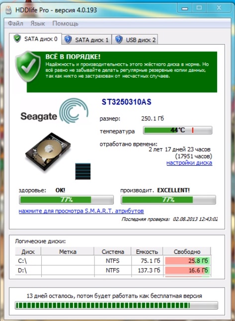 یہ پروگرام ونڈوز آپریٹنگ سسٹم کے کسی بھی ورژن کے ساتھ بالکل کام کرتا ہے۔ آپ HDDlife کو 14 دنوں تک مفت استعمال کر سکتے ہیں، جس کے بعد آپ اسے آفیشل ویب سائٹ پر خرید سکتے ہیں۔ اوسط قیمت 550 روبل ہے.