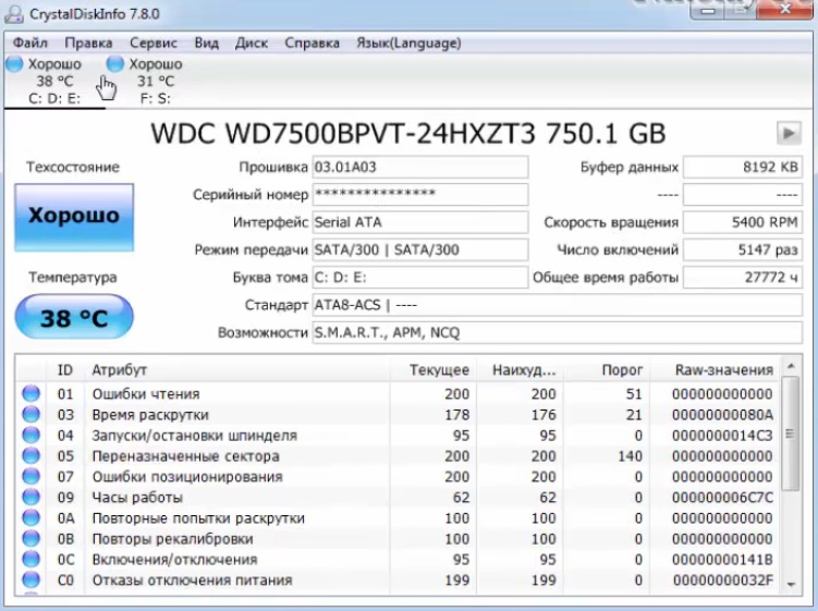 CrystalDiskInfo کا استعمال کرتے ہوئے، آپ ہارڈ ڈرائیو کی سطح پر مستقبل قریب میں ہونے والی خرابیوں کے بارے میں پڑھ اور معلومات حاصل کر سکتے ہیں۔ اس سے ناکامی ہونے سے پہلے اہم معلومات کو دوسرے میڈیم میں کاپی کرنا ممکن ہو جائے گا۔ اس طرح، تمام قیمتی ڈیٹا محفوظ رہے گا۔ HDD کی حیثیت کا اندازہ SMART اوصاف کی جانچ کر کے لگایا جاتا ہے۔