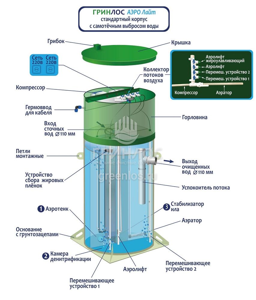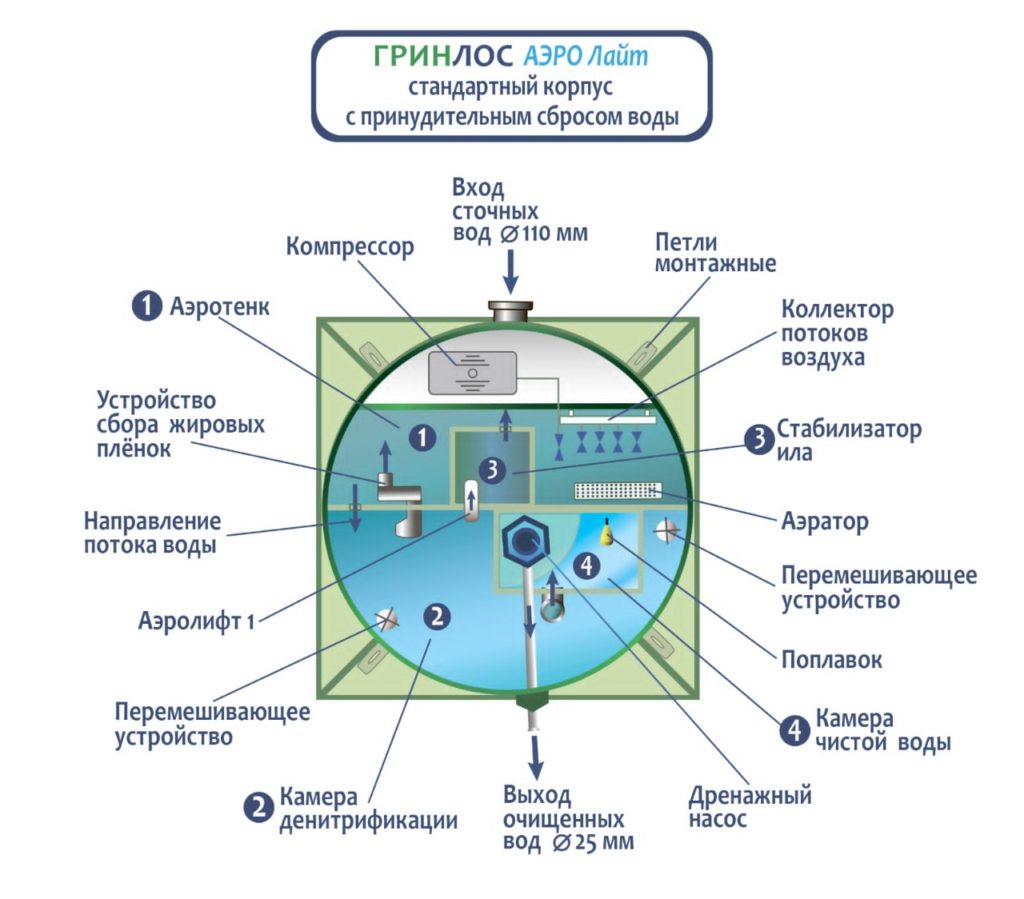 اس طرح کے عمل کی تنظیم میں تنہائی، گندے پانی کو علیحدہ کنٹینرز میں الگ کرنا اور ان کے مسلسل بہاؤ کو یقینی بنانا شامل ہے۔ GRINLOS سیپٹک ٹینک کو اس طرح ڈیزائن کیا گیا ہے کہ تمام الگ الگ چیمبر ایک ہی عمارت میں واقع ہوں۔ یہ ایک بیلناکار یا بیضوی مصنوعات ہو سکتا ہے. مرکزی سلنڈر کے اندر واقع تمام پانچ کمپارٹمنٹس، جن کا باڈی بنیادی پولی پروپیلین سے بنا ہے، خصوصی تکنیکی اوور فلو کے ذریعے ایک دوسرے سے جڑے ہوئے ہیں۔