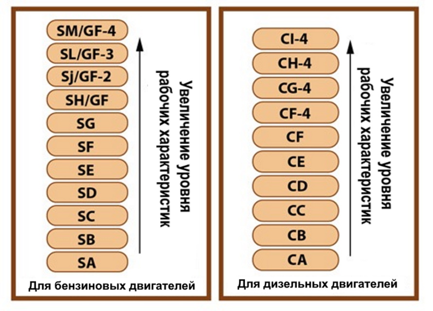 امریکن پیٹرولیم انسٹی ٹیوٹ (API) کے مطابق، مصنوعات کی درجہ بندی کارکردگی کے معیارات اور ڈیزل اور پٹرول انجن کے معیار کی سطح کے مطابق کی جاتی ہے۔ ان کی وضاحت API CE یا API SJ کے مخففات کا استعمال کرتے ہوئے کی گئی ہے، جس میں: