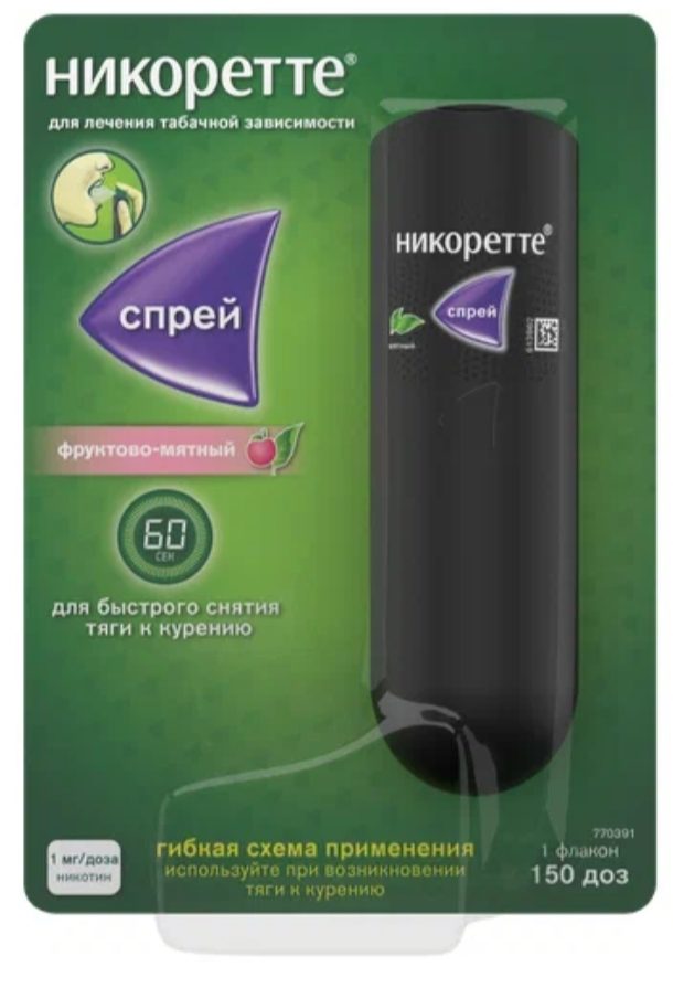 منشیات کی مائع شکل، 150 ملی لیٹر. یہ دھواں کی بو پر جسم کے منفی ردعمل کا سبب بنتا ہے، تیزی سے کام کرتا ہے. پودینہ اور پھل دار پودینے کے ذائقے ہیں۔ ہر شیشی میں 150 خوراکیں ہوتی ہیں۔ اس وقت لگائیں جب سگریٹ پینے کی خواہش ہو۔ زیادہ سے زیادہ خوراک 64 خوراکیں فی دن ہے۔ کورس - 6 ہفتے. Nicorette پیچ کے ساتھ مل کر کیا جا سکتا ہے.