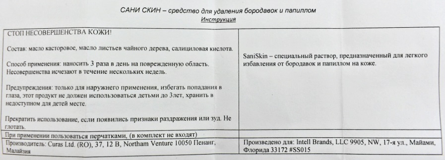 ینالاگوں پر اس دوا کا فائدہ اطلاق کے پیمانے میں ہے۔ کریم کا استعمال جسم کے مختلف حصوں بشمول چہرے، مباشرت مقامات اور چپچپا جھلیوں میں ہونے والی نشوونما کو ختم کرنے کے لیے کیا جاتا ہے۔ گھر میں استعمال میں آسانی، اسے مقبول ترین ماڈلز میں رکھا گیا۔ اس بات کی 100% گارنٹی کے علاوہ کہ پیپیلوما خشک ہو جائے گا، سانی سکن دھبے اور نشانات یا کوئی نقصان نہیں چھوڑتا ہے۔اہم جز ارنڈ اور چائے کے درخت کا تیل، سیلیسیلک ایسڈ ہے، جو زیادہ مقدار میں نازک جلد پر جلنے کی صلاحیت رکھتا ہے، یا استعمال کی بڑھتی ہوئی تعدد ہے۔ 15 ملی لیٹر کی 2 بوتلوں کے لئے 1260 روبل۔