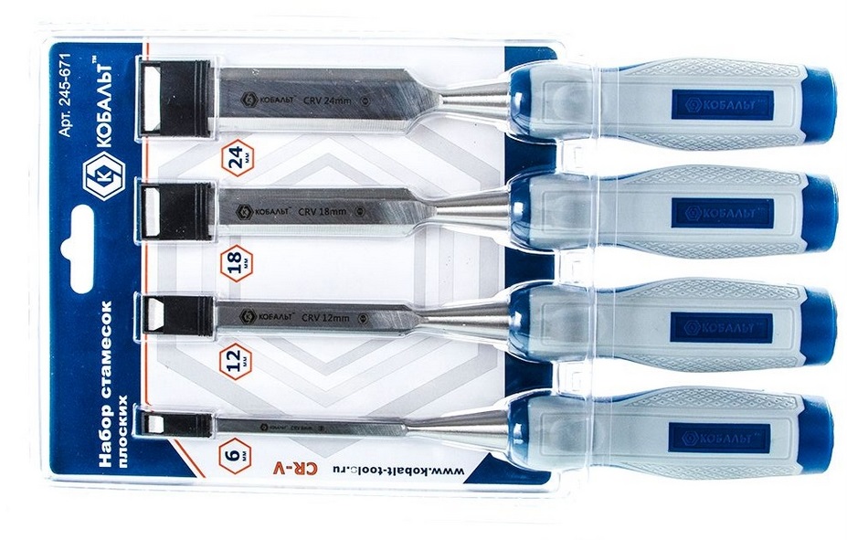 سیٹ میں 6، 12، 20 اور 26 ملی میٹر کی چوڑائی کے ساتھ کروم مینگنیج اسٹیل سے بنے فلیٹ بلیڈ کے ساتھ چار چھینی شامل ہیں۔ یہ اوزار لکڑی کے ساتھ کام کرنے کے لیے موزوں ہیں: نقش و نگار، سوراخ کرنے والے۔