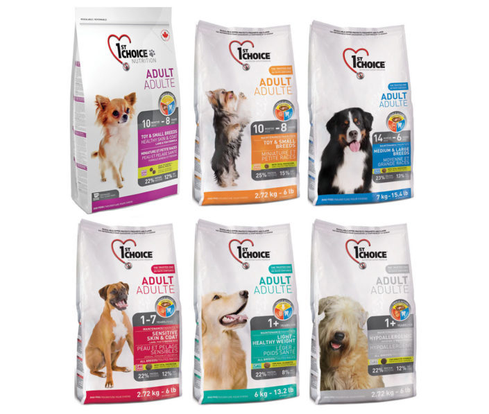کینیڈین کمپنی فرسٹ چوائس فوڈ کتوں کی مختلف اقسام کے لیے تیار کی گئی ہے۔ ساخت کا اہم حصہ چکن، میمنے، بتھ یا ہیرنگ سے آٹا ہے. اس کے علاوہ، اس میں دلیا، چاول، جو کے اناج شامل ہیں، اور کچھ اقسام میں آپ کو آلو کا آٹا بھی مل سکتا ہے، جب خلاصہ کیا جائے تو، اضافی اجزاء کا حصہ گوشت کے حصے سے زیادہ ہے۔ دانے دار فائبر سے بھرپور ہوتے ہیں، جو چقندر اور ٹماٹر کے گودے، اومیگا 3 اور اومیگا 6 ایسڈز، ایل کارنیٹائن کی شکل میں پیش کیے جاتے ہیں۔ اس کے ساتھ ساتھ چکوری اور یوکا شیڈیگرا کے عرق، جو ہاضمہ کو بہتر بناتے ہیں۔ فیڈ اور کیلشیم پروپیونیٹ میں موجود، اس سے مراد مصنوعی حفاظتی عناصر ہیں جو جسم پر ناخوشگوار اثر ڈال سکتے ہیں۔ کمپنی بالغوں اور کتے کے بچوں کے لیے، بڑی اور درمیانی نسلوں اور ہائپوالرجینک شکل کے لیے کئی لائنیں تیار کرتی ہے۔
