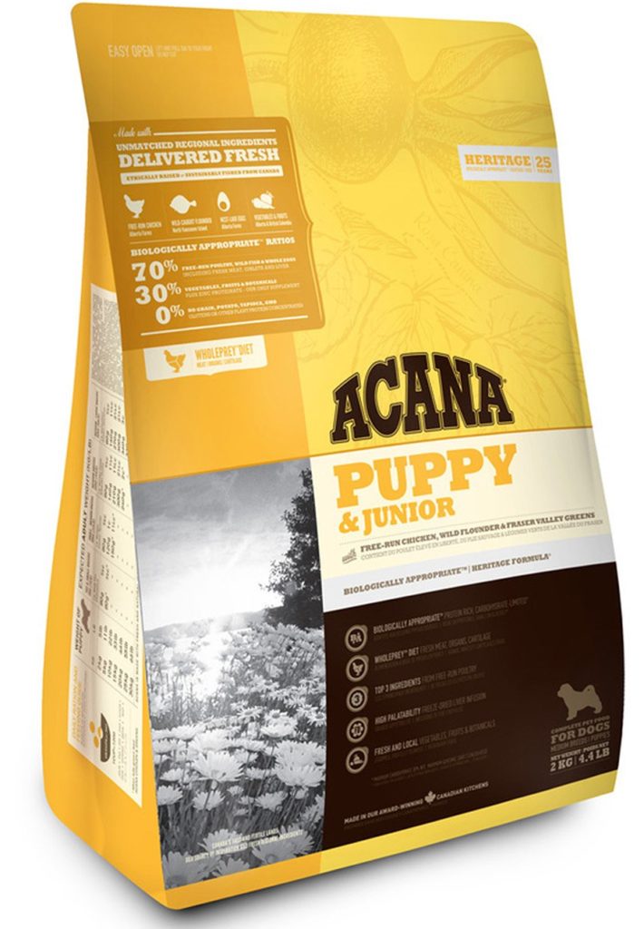 کینیڈین ساختہ Acana Puppy & Junior کا تعلق پریمیم کلاس سے ہے اور خاص طور پر درمیانی نسل کے کتے کے لیے ڈیزائن کیا گیا ہے۔ چھوٹے کتوں کو ذہن میں رکھتے ہوئے وضع کردہ، بچے تیزی سے نشوونما اور بڑھنے کا رجحان رکھتے ہیں اور اس عمل کو سہارا دینے کے لیے انہیں غذائی اجزاء کی ضرورت ہوتی ہے۔اہم اجزاء میں چکن کا گوشت خشک اور کچی شکل میں، خشک ترکی، چکن آفل جیسے جگر، دل، فلاؤنڈر، ہیرنگ، انڈے، نیز سبز پھلیاں اور پیلے مٹر شامل ہیں۔ اس کے علاوہ طحالب اور پھل بھی شامل کیے جاتے ہیں۔