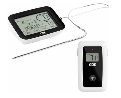 جرمن برانڈ ADE سے ڈیجیٹل تھرمامیٹر۔ ماڈل ریموٹ درجہ حرارت کنٹرول کے لیے ریڈیو ریسیور سے لیس ہے۔ ڈیٹا ٹرانسمیشن کی حد 60 میٹر ہے۔ڈیزائن مندرجہ ذیل ہے: ایک سٹینلیس سٹیل کی تحقیقات 16 سینٹی میٹر لمبی، ایک حرارت سے بچنے والی کیبل 1 میٹر لمبی، ایک ماپنے والا یونٹ جس میں آپریٹنگ موڈ کو منتخب کرنے کے لیے ایک بڑا ڈسپلے اور ٹچ بٹن، ایک وائرلیس ریسیور۔ یہ آلہ خودکار اور دستی دونوں طریقوں میں کام کر سکتا ہے۔ پہلے میں، آپ 7 قسم کے گوشت اور 5 ڈگری بھوننے میں سے انتخاب کر سکتے ہیں۔ دستی موڈ آپ کو ذاتی ضروریات کے لیے ڈیوائس کو اپنی مرضی کے مطابق کرنے کی اجازت دیتا ہے، مثال کے طور پر، شربت یا کریم تیار کرنا۔