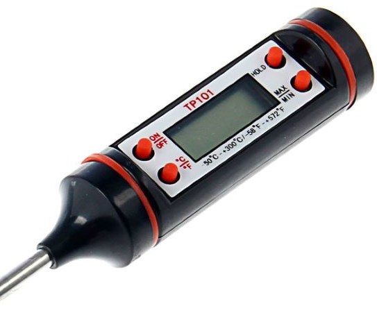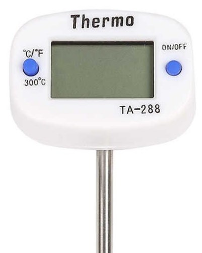 چین میں بنایا گیا ملٹی فنکشنل الیکٹرانک تھرمامیٹر۔ ڈیوائس میں 15 سینٹی میٹر لمبی سوئی اور ایک پیمائشی یونٹ ہوتا ہے۔ بلاک کا جسم پلاسٹک سے بنا ہے، لہذا آپ کو تندور میں آلہ نہیں چھوڑ سکتے ہیں. پیمائش کرنے والا یونٹ ایک LCD ڈسپلے سے لیس ہے جو ماپا درجہ حرارت دکھاتا ہے۔ کنٹرول کے لیے 4 بٹن فراہم کیے گئے ہیں: آن/آف - آن/آف کرنے کے لیے، °С/°F - سیلسیس سے فارن ہائیٹ میں سوئچ کریں، ہولڈ - موجودہ ریڈنگز کو ٹھیک کرنے کے لیے، MIN/MAX - کم سے کم اور زیادہ سے زیادہ اقدار کو ظاہر کرنے کے لیے پیمائش کی مدت کے لئے. پیمائش کی حد -50 سے +300 کے بارے میںC (-58°F - +572°F)۔ درستگی ±1 ہے۔کے بارے میںC (1.8°ایف)۔ پاور سورس بیٹری کی قسم AG13 یا LR44 (1.5V) ہے۔