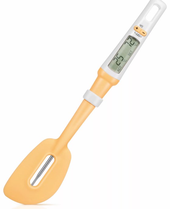 چیک مینوفیکچرر ٹیسکوما سے ڈیجیٹل کچن ڈیوائس۔ ماڈل اپنی استعداد اور استعداد کے ساتھ موہ لیتا ہے۔ یہ ایک الیکٹرانک تھرمامیٹر ہے، جس پر، اگر ضروری ہو تو، ایک سلیکون اسپاتولا لگایا جا سکتا ہے۔ تحقیقات اعلی معیار کے سٹینلیس سٹیل سے بنا ہے، جسم پلاسٹک سے بنا ہے.پیمائش کرنے والے یونٹ پر 2 بٹن ہیں: آن اور آف، جو مطلوبہ قدر ٹائپ کرتے وقت + اور - کے طور پر بھی استعمال ہوتے ہیں۔ یونٹ ایک ڈسپلے سے لیس ہے جو 2 اشارے دکھاتا ہے - ڈش کا موجودہ درجہ حرارت اور سیٹ ویلیو۔ جب ڈش مقررہ قیمت تک پہنچ جاتی ہے، تو آلہ آپ کو صوتی سگنل کے ساتھ مطلع کرتا ہے۔ پیمائش کی حد 0 سے 250 تک ہے۔°C. پاور دو LR44 بیٹریوں سے فراہم کی جاتی ہے، جو شامل ہیں۔