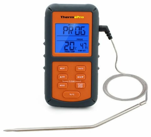 معروف صنعت کار تھرمو پرو کا الیکٹرانک تھرمامیٹر۔ ڈیزائن پچھلے ماڈل سے ملتا جلتا ہے: پروب 16 سینٹی میٹر، گرمی سے بچنے والی کیبل 1 میٹر لمبی، پیمائشی یونٹ۔ یہ ٹول 8 قسم کے گوشت کو مختلف ڈگریوں کے بھوننے (5 اقسام) کو پکانے کے لیے ڈیزائن کیا گیا ہے، بشمول مچھلی، گرل اور باربی کیو۔ یونٹ ایک LCD ڈسپلے سے لیس ہے، جو منتخب آپریٹنگ موڈ، ڈش کا موجودہ درجہ حرارت، اور سیٹ ویلیو دکھاتا ہے۔ کیس پر 7 بٹنوں کے ذریعے ایڈجسٹمنٹ کی جاتی ہے۔ پہلے سے طے شدہ پروگراموں میں کام کرنے کے علاوہ، ڈیوائس کو مینوئل موڈ میں بھی استعمال کیا جا سکتا ہے، جس میں آپ آزادانہ طور پر کھانا پکانے کے ضروری حالات سیٹ کر سکتے ہیں۔ اس کے علاوہ، آلہ ایک ٹائمر سے لیس ہے، جو سامنے والے پینل پر بٹنوں کا استعمال کرتے ہوئے ترتیب دیا گیا ہے. درجہ حرارت کی حد -9 سے +250 ° С تک۔ پیمائش کی درستگی ±1°C. ریڈنگز کو سیلسیس اور فارن ہائیٹ میں دکھایا جا سکتا ہے۔ ڈیوائس کو چلانے کے لیے 2 AAA بیٹریاں درکار ہیں۔