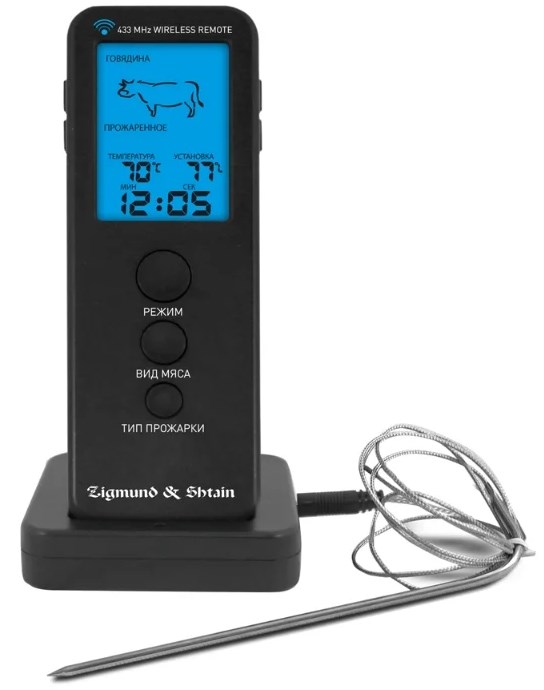 جرمن برانڈ Zigmund & Shtain Kuchen سے گوشت کے درجہ حرارت کی جانچ۔ ماڈل ایک جدید ٹول ہے جس میں 30 میٹر تک کے فاصلے پر معلومات کی ترسیل کی صلاحیت ہے۔یہ مندرجہ ذیل حصوں پر مشتمل ہے: ایک اسٹیل کی تحقیقات، ایک گرمی سے بچنے والی ہڈی 1 میٹر لمبی، ایک وائرلیس پیمائش کرنے والا یونٹ جس میں LCD ڈسپلے ہے، ایک ٹرانسمیٹنگ بیس۔ پیمائش یونٹ کنٹرول اور ایڈجسٹمنٹ کے لیے 7 بٹنوں سے لیس ہے۔ ان بٹنوں کا استعمال کرتے ہوئے، آپ تھرمامیٹر کے آپریشن کے موڈ کو منتخب کر سکتے ہیں - خودکار یا دستی. خودکار موڈ میں، آپ گوشت کی قسم (8 اقسام) اور فرائی کی قسم (5 اقسام) کو منتخب کر سکتے ہیں، اور درجہ حرارت خود بخود سیٹ ہو جائے گا۔ دستی موڈ میں، آپ آزادانہ طور پر کسی بھی ڈش کے لیے مطلوبہ درجہ حرارت کو ایڈجسٹ کر سکتے ہیں۔ آپ پیمائش کی اکائی بھی منتخب کر سکتے ہیں - سیلسیس یا فارن ہائیٹ۔ اس کے علاوہ، ڈیوائس ایک ٹائمر سے لیس ہے جو 100 منٹ تک فارورڈ یا بیکورڈ کاؤنٹ ڈاؤن موڈ میں کام کر سکتا ہے۔ ڈش کی تیاری کا اشارہ صوتی سگنل سے ہوتا ہے۔ پیمائش کی حد -20 سے +250°C. 4 AAA بیٹریوں سے تقویت یافتہ۔