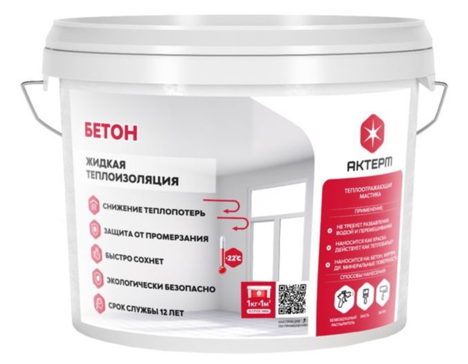 بڑے کمروں کے علاج کے لیے ماہرین ایئرلیس سپرے یونٹس کا استعمال کرتے ہوئے مائع تھرمل موصلیت کا استعمال کرنے کا مشورہ دیتے ہیں۔ AKTERM Beton™ 2,5,10 اور 20 لیٹر پلاسٹک کی بالٹیوں میں تیار کیا جاتا ہے۔