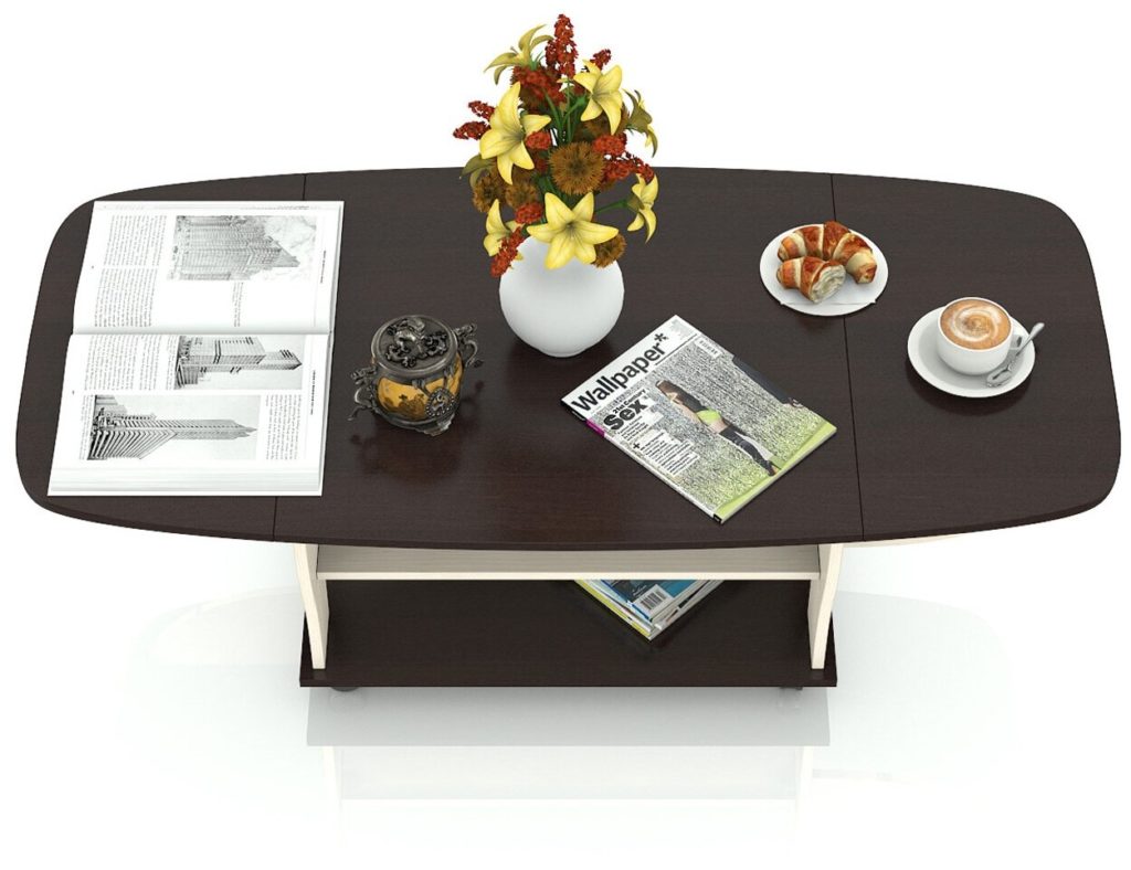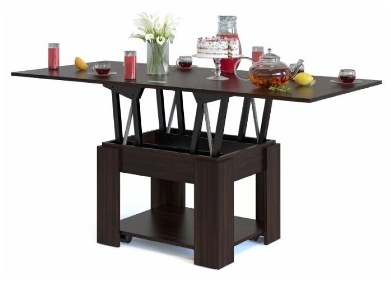 خوبصورت سجاوٹ کے ساتھ Vita Mebel کمپنی کا خوبصورت ماڈل مالک کے بہتر ذائقہ پر زور دے گا۔ 79 x 65 سینٹی میٹر ٹیبل ٹاپ کھولنے پر 158 سینٹی میٹر تک پھیلتا ہے اور ایک مکمل کھانے کی میز میں بدل جاتا ہے۔ اس کے نیچے سٹوریج سیلز ہیں، نیچے ایک وسیع شیلف ہے۔ اونچائی - 54 سینٹی میٹر، کھولنے پر بڑھ جاتی ہے۔ MDF سے بنایا گیا۔