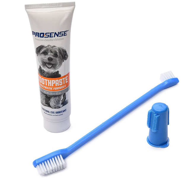 ٹوتھ پیسٹ، کلاسک برش اور انگلیوں پر مشتمل منہ کی دیکھ بھال کا سیٹ۔ پیسٹ بالکل محفوظ ہے، یہ اس کی صحت کو نقصان نہیں پہنچائے گا چاہے غلطی سے نگل جائے اور طریقہ کار کے بعد اسے کلی کرنے کی ضرورت نہیں ہے۔ اس کی ساخت مؤثر طریقے سے دانتوں کی سطح کو تختی سے صاف کرتی ہے، ٹارٹر کی تشکیل کو روکتی ہے۔ 8 میں 1 پرو سینس ٹولز چھوٹے اور بڑے کتوں کے لیے موزوں ہیں۔کلاسک برش میں لمبا، آرام دہ ہینڈل ہوتا ہے۔ انگلی کی نوک آپ کو مشکل سے پہنچنے والی جگہوں تک جانے کی اجازت دیتی ہے۔ دونوں مصنوعات پائیدار پلاسٹک سے بنی ہیں اور نیلے رنگ میں دستیاب ہیں۔ ایک سیٹ کی اوسط قیمت 801 روبل ہے۔
