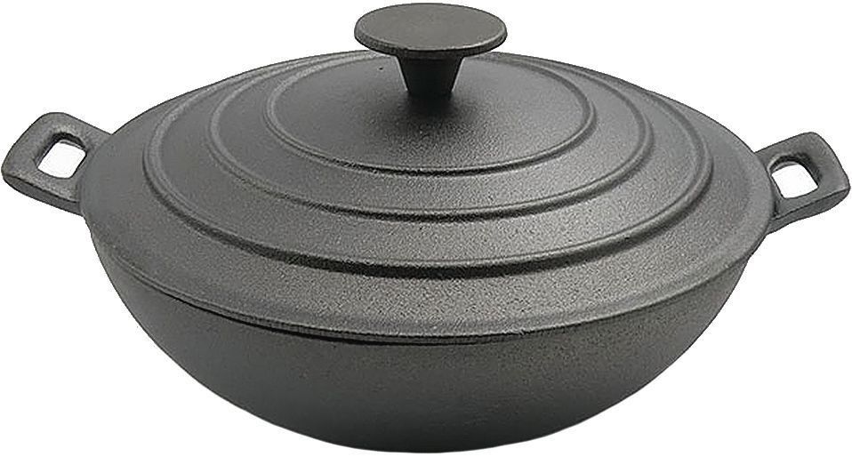 یہ wok pans کا روسی نمائندہ ہے۔ یہ کاسٹ آئرن سے بنا ہے، جو اسے ایک ہی قطر کے ینالاگ سے زیادہ بھاری بناتا ہے۔ قطر 26 سینٹی میٹر۔ کراس سیکشن میں نیچے کا حصہ تقریباً 8 سینٹی میٹر ہے۔ باہر سے، پین زیادہ کڑھائی کی طرح لگتا ہے۔